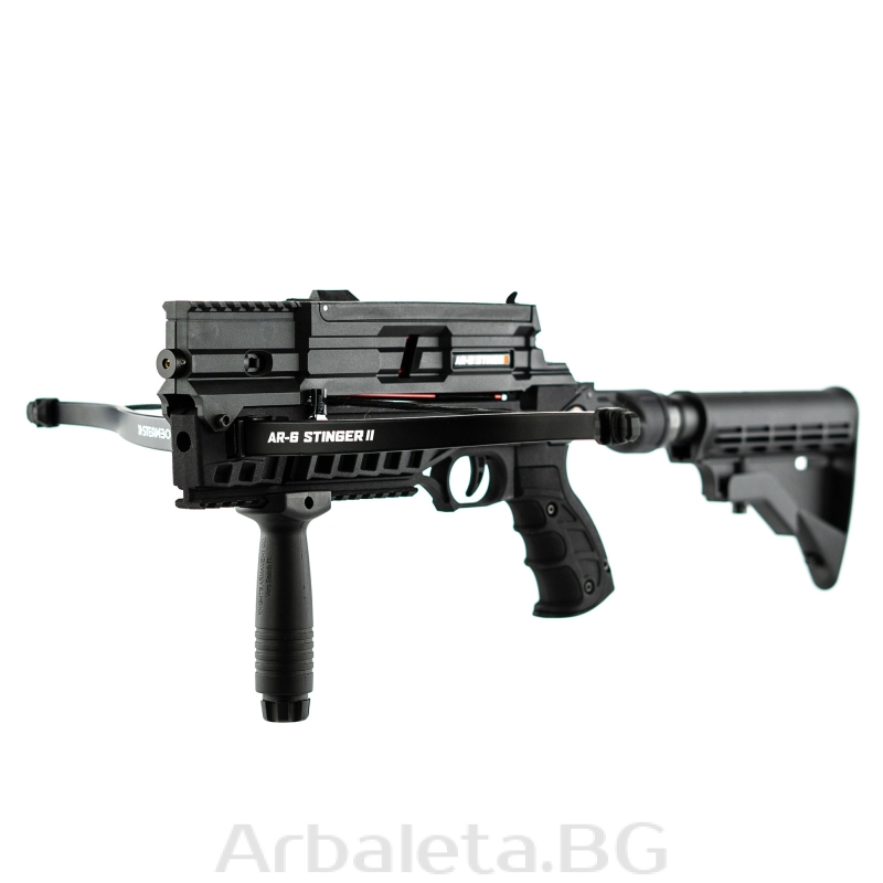 Steambow AR-6 Stinger II Tactical е многофункционален пистолет с арбалет с пълнител с капацитет 6 стрели, приклад AR-15 и предна ръкохватка, както и по-дълга пикатини шина за монтиране на допълнителни аксесоари. Включва 6 практични стрели Stinger, 2 тетиви, тетивен механизъм, не включва лазера в изображенията.