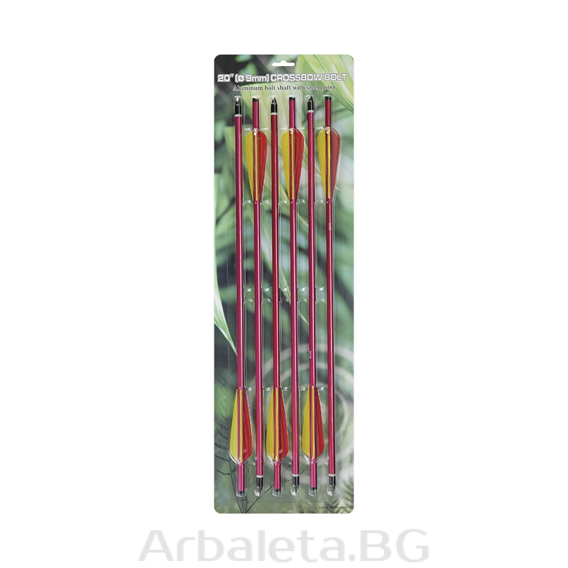 Комплект от 6 стрели за алуминиев арбалет от Man Kung с дължина 20 инча, диаметър 9 мм, общо тегло 30 грама, шипове 2219. Включва накрайници за спортна стрелба с резба.