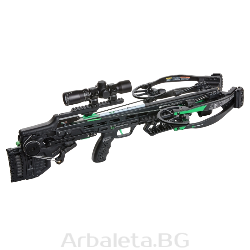 Sinister е напълно регулируем, като се започне от приклада тип „булкуп“, предната ръкохватка, ограничителите на тетивата, гребена на бузата и приклада, което ви позволява да адаптирате този лък към потребителя. Със 164 фута кинетична енергия, която изстрелва стрелите със скорост 430 fps, Sinister 430 осигурява изключителна комбинация от скорост, мощност и маневреност при лов от седло, стойка или сляпо. Алуминиевият щурвал, CNC системата на кулачките, технологията против сух огън и ролковата задържаща пружина осигуряват изключителна, повтаряща се точност и ефективност изстрел след изстрел.