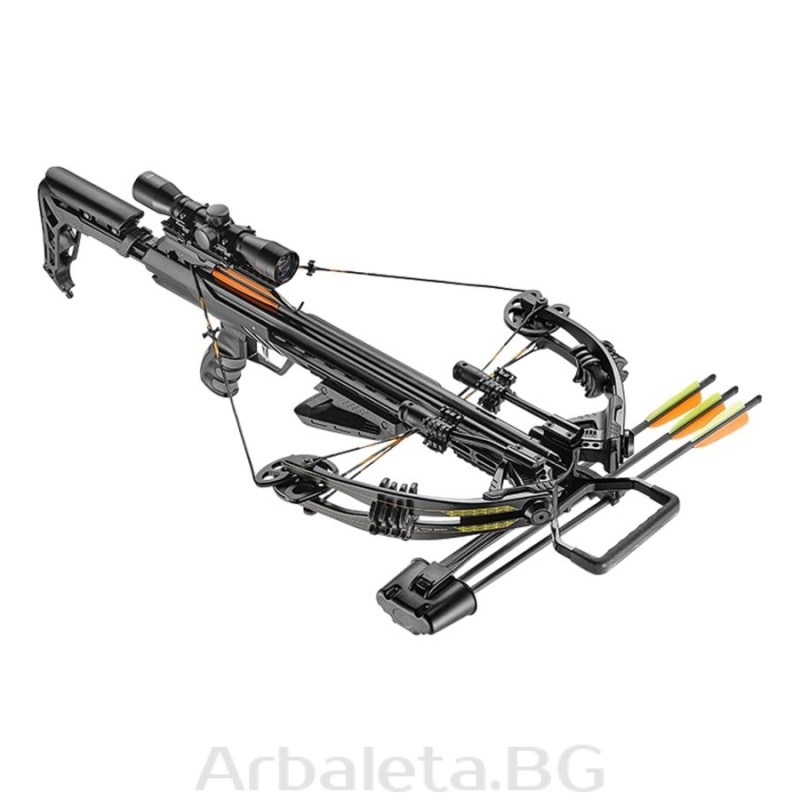 Setul include arbaleta echipata cu sistem de ochire tip luneta, tolba sageti si patru sageti de carbon cu varfuri de tir sportiv, coarda de spate si mecanism de incarcare tip franghie. Include maner similar TAC-PAC Excalibur montat pe sina Weaver, sina pe care alternativ se poate monta un bipod.