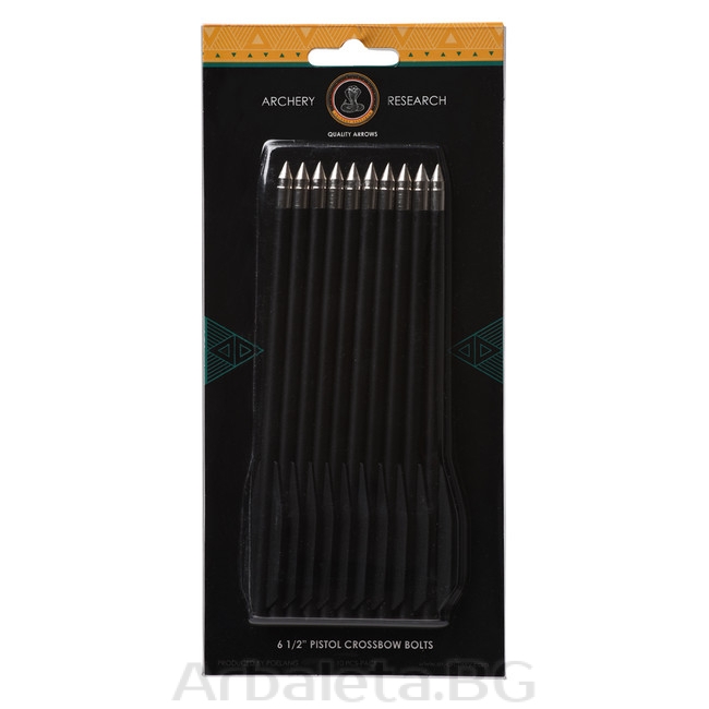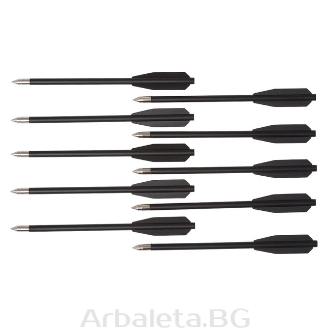 Set de sageti pentru pistol arbaleta din fibra de sticla cu varf metalic EK Archery. 2 pene, lungime 6.5 inch (16.5 cm). Pachetul include 10 bucati.