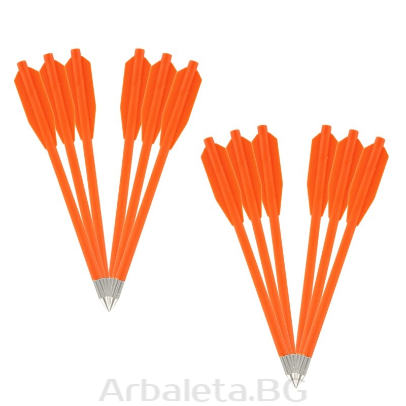 Set de sageti pentru pistol arbaleta din fibra de sticla cu varf metalic Skorpion. 2 pene, lungime 6.5 inch (16.5 cm). Pachetul include 12 bucati.
